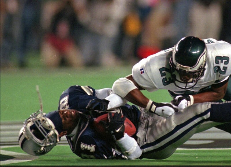 Deion Sanders Cowboys Deion Sanders, left, has his helmet knocked off as he is tackled by the Philadelphia Eagles Troy Vincent after Sanders caught a 39 yard pass from Troy Aikman in second quarter action in Philadelphia, Monday Sept. 30, 1996. (AP Photo/Chris Gardner) (CHRIS GARDNER/ASSOCIATED PRESS)