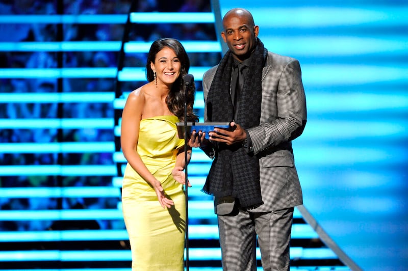 Deion Sanders Actress Emmanuelle Chriqui, left, and former NFL player Deion Sanders speak on stage at the 3rd annual NFL Honors at Radio City Music Hall on Saturday, Feb. 1, 2014, in New York. (Photo by Evan Agostini/Invision for NFL/AP Images) (Evan Agostini/Evan Agostini/Invision/AP)