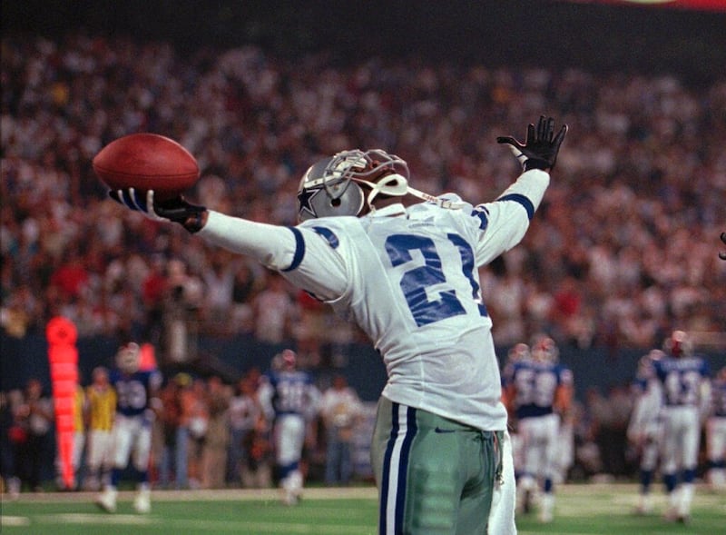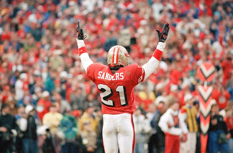 Deion Sanders Deion Sanders acknowledges the crowd, Sunday, Jan. 15, 1995, as his San Francisco 49ers' defeated the Dallas Cowboys, 38-28, to win the NFC Championship. (AP Photo/Paul Sakuma) (Paul Sakuma/AP)