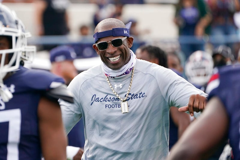 Deion Sanders Jackson State football coach Deion Sanders smiles as he greets his defensive squad after they had recovered a Mississippi Valley State fumble for a touchdown during the second half of an NCAA college football game, Sunday, March 14, 2021, in Jackson, Miss. (AP Photo/Rogelio V. Solis) (Rogelio V. Solis/AP)