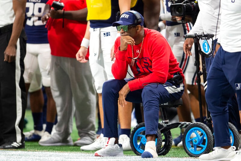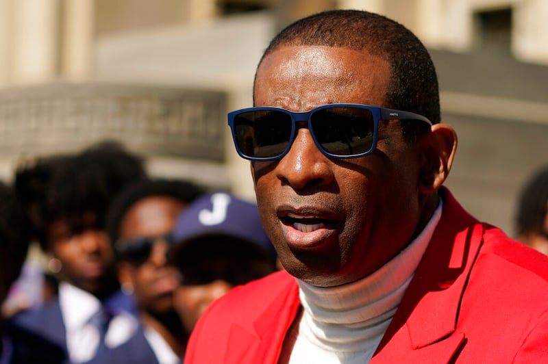 Deion Sanders Jackson State head coach Deion Sanders watches his team as they play Prairie View during the first half of the Southwestern Athletic Conference championship NCAA college football game, Saturday, Dec. 4, 2021, in Jackson, Miss. (AP Photo/Rogelio V. Solis) (Rogelio V. Solis/AP)